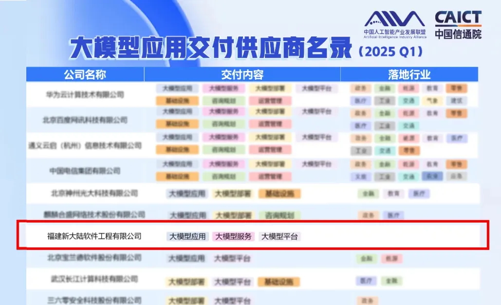 近日,中國人工智能產(chǎn)業(yè)發(fā)展聯(lián)盟(AIIA)與中國信息通信研究院聯(lián)合發(fā)布《大模型應(yīng)用交付供應(yīng)商名錄(2025年Q1)》。憑借在大模型應(yīng)用交付領(lǐng)域的卓越技術(shù)實(shí)力與豐富實(shí)踐成果,新大陸成功入選名錄,標(biāo)志著公司在人工智能產(chǎn)業(yè)生態(tài)中的技術(shù)能力再獲權(quán)威認(rèn)可。