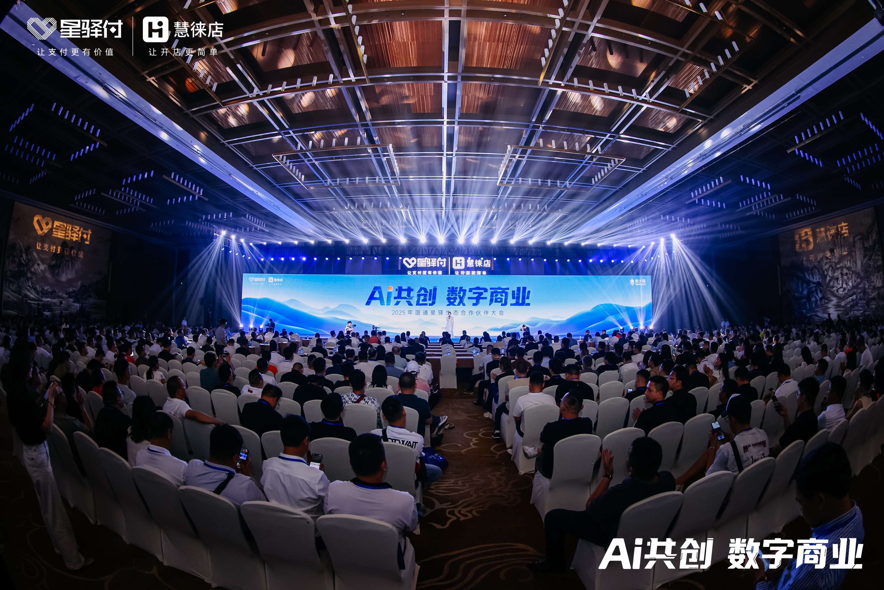 閩江之畔,數字浪潮澎湃而起。5月7日,福州閩越水鎮迎來一場數字商業盛會——“AI共創 數字商業”2025年國通星驛生態合作伙伴大會。福建省商務廳相關領導,北京大學光華管理學院教授,中國銀聯及華通銀行、興業銀行、民生銀行、華夏銀行、浦發銀行等金融機構代表,全國各地的上千位生態合作伙伴代表線下參會。新大陸科技集團董事長胡鋼、董事副總裁林學杰及集團和上市公司領導齊弘、徐志凌、胡鵠蒞臨大會現場。新大陸國通星驛董事長陳藝、總經理林堅攜管理團隊與眾位與會領導、嘉賓共同探討數字商業在AI浪潮下的創新發展路徑。